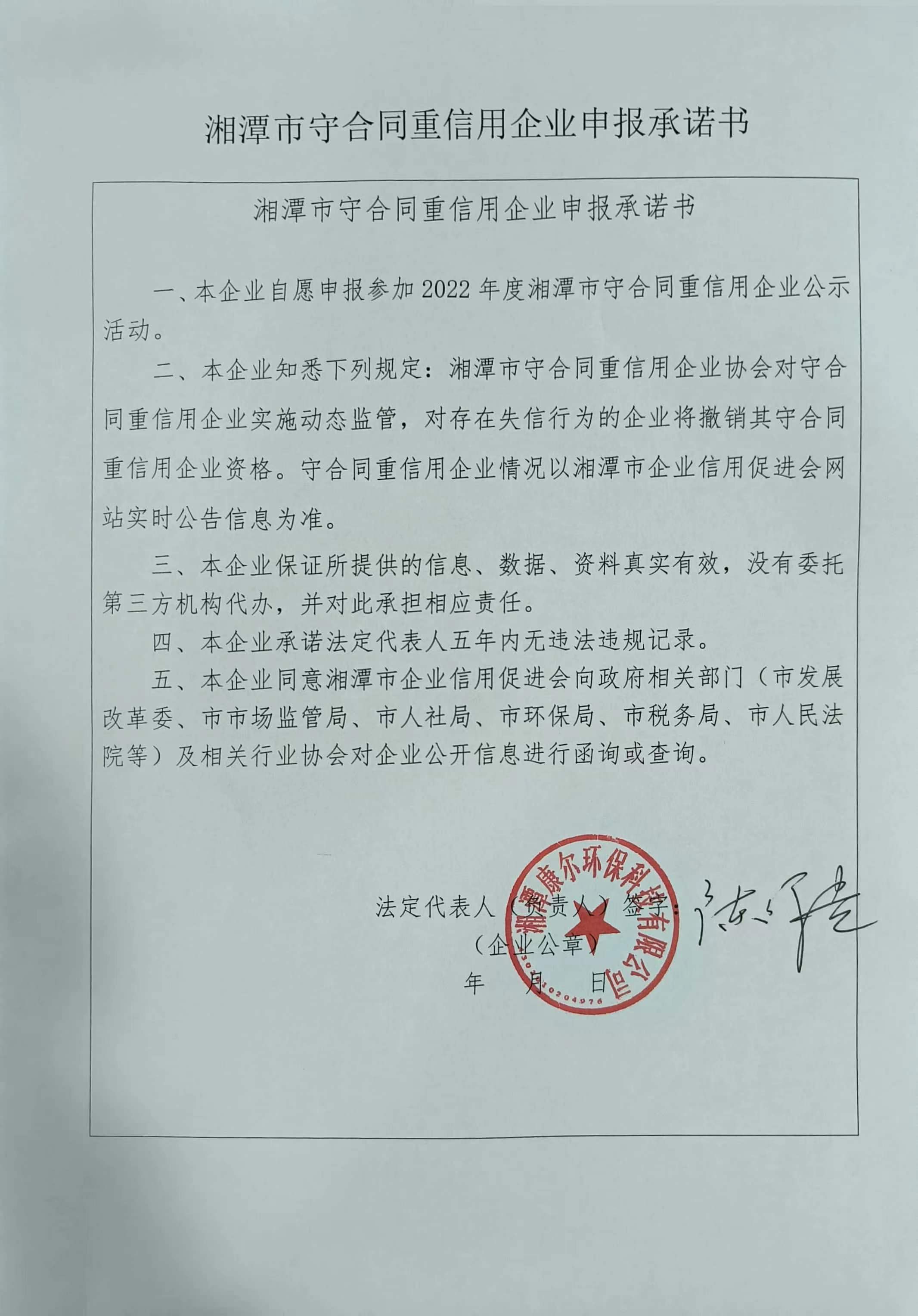 本企業(yè)根據(jù)《湘潭市守合同重信用企業(yè)申報(bào)規(guī)定》等編制 2022 年度企業(yè)信用報(bào)告書,并保證本報(bào)告書內(nèi)容真實(shí)、準(zhǔn)確、完整。